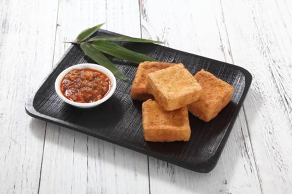 燒熱鍋放油,投入臭豆腐拉油至金黃色,倒入漏勺瀝干油擺入盤中待用;