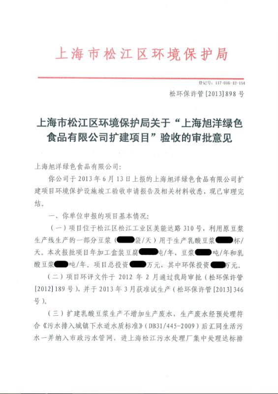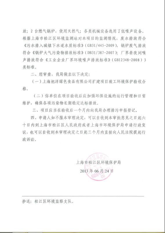 【公告】上海市松江區環境保護局關于“上海旭洋綠色食品有限公司擴建項目”驗收的審批意見